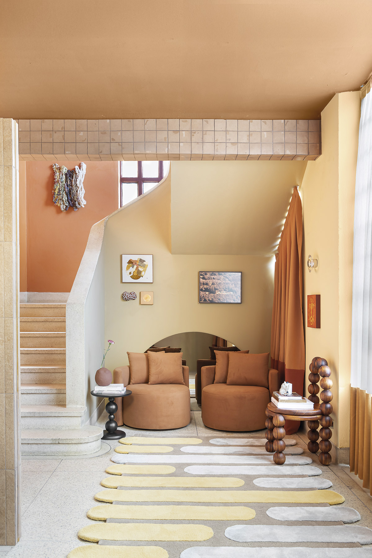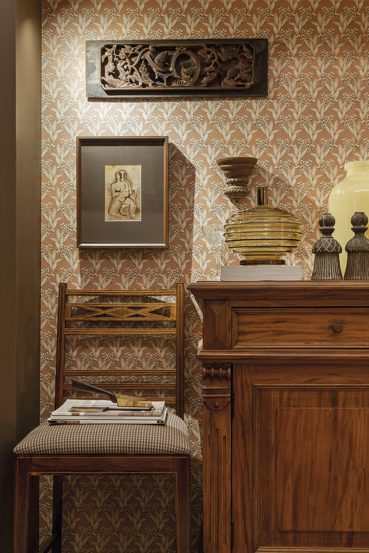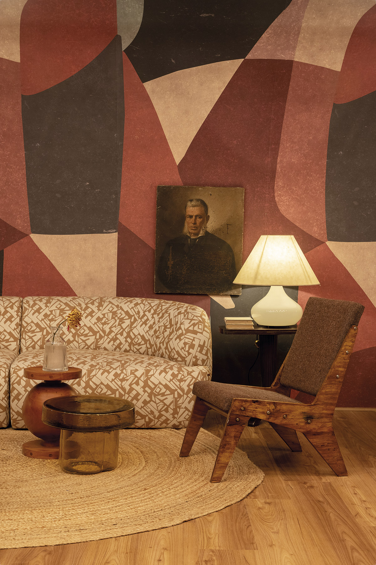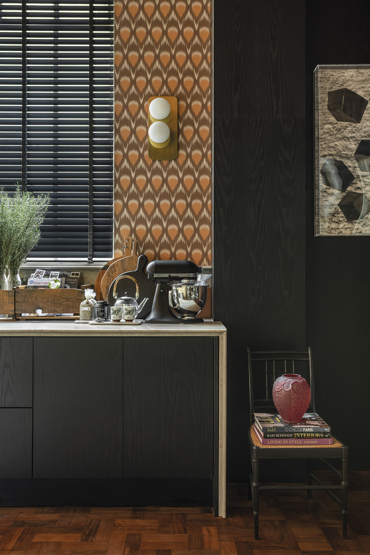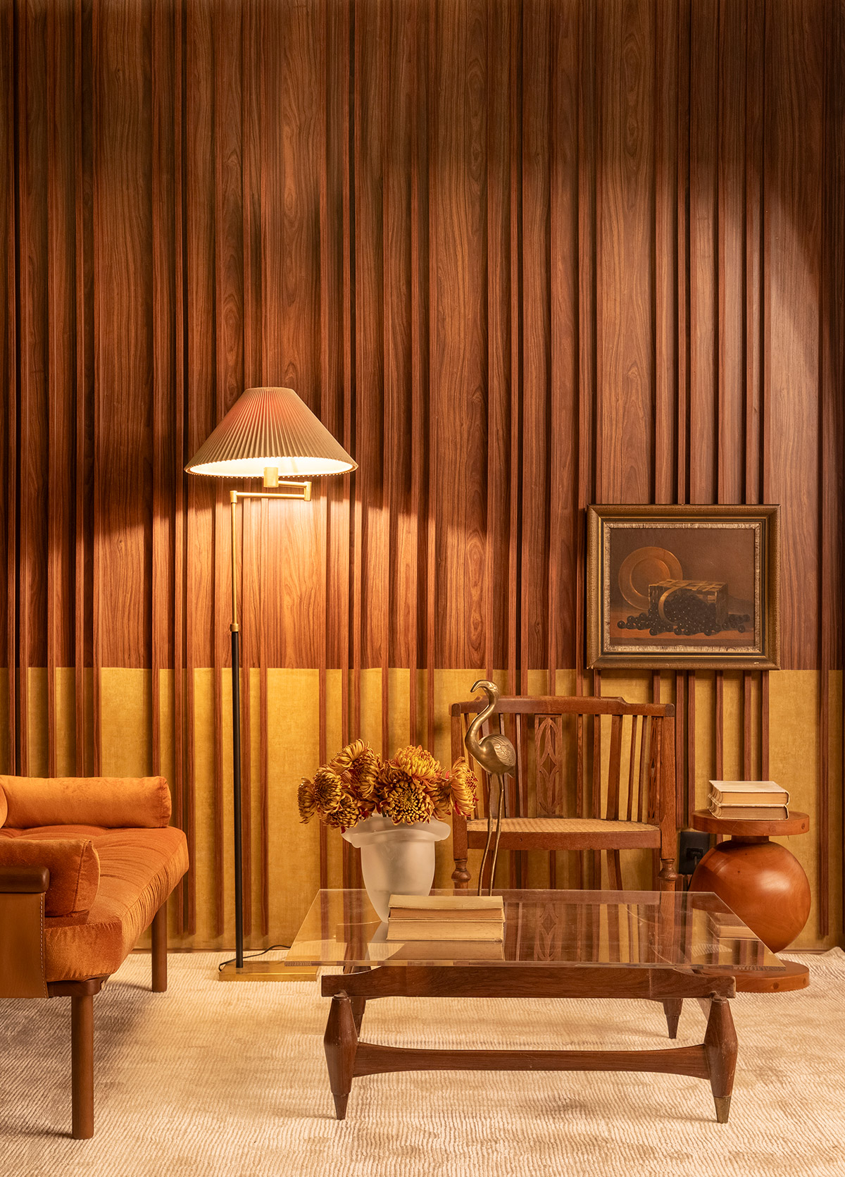 As cores também ajudam a contar essa história: laranja queimado, vermelho fechado e um rose puxado para o salmão dominam a paleta e aquecem os espaços. Em contraste, madeiras escuras entram em cena trazendo profundidade e uma sensação de boa estrutura. É o mix que funciona: quente, elegante e cheio de textura. Aliás, papéis de parede estampados e tecidos encorpados reforçam essa proposta sensorial, que vai além do visual — é uma experiência tátil também.