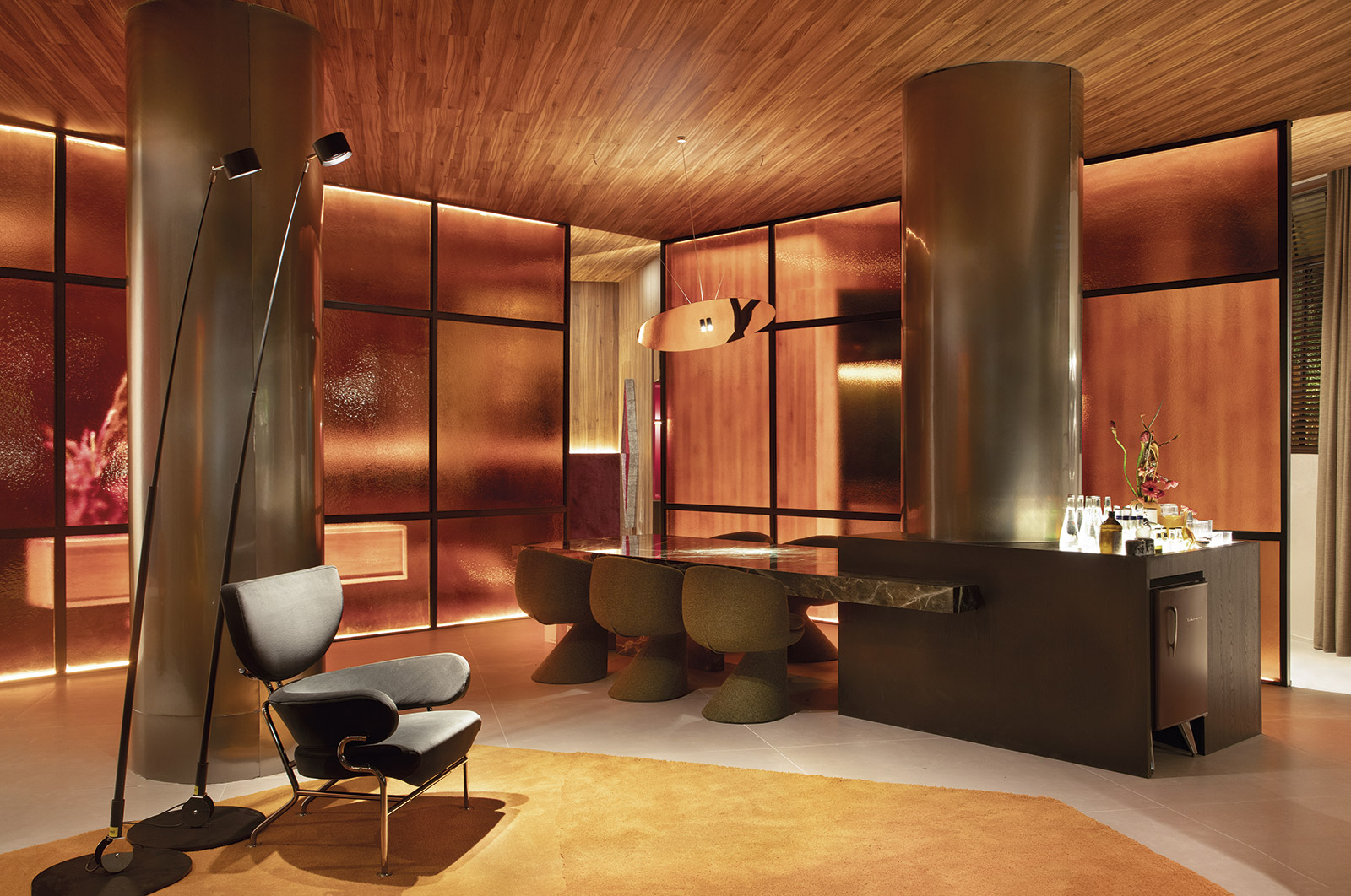 A iluminação é outro ponto de destaque. Nada de luz impessoal: aqui, a aposta é na luz baixa, indireta, que vem de abajures e luminárias esculturais, criando um clima de aconchego e intimidade. É como entrar num refúgio no meio da cidade.